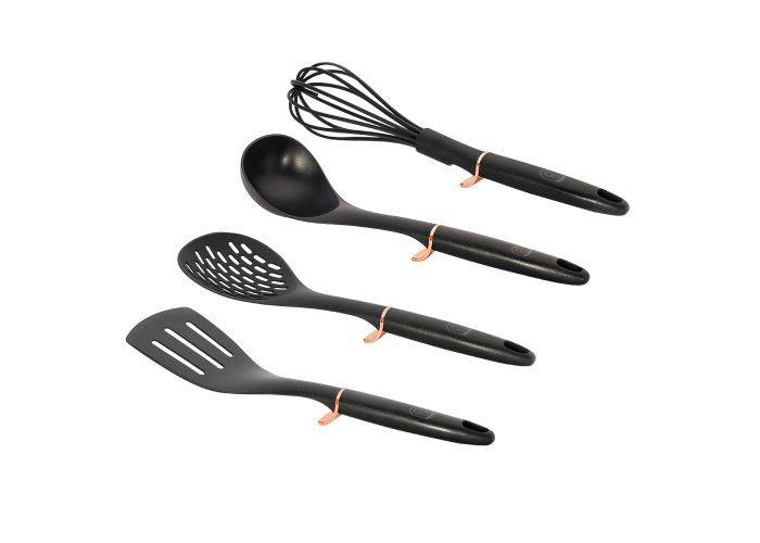Verktygen är gjorda av nylon med ett fantastiskt metalliskt svart handtag. De är lämpliga för användning i alla typer av non-stick kokkärl och huvudena är värmebeständiga till 200°C. De mjuka handtagen ger ett bekvämt grepp och hål i handtagets ände för enkel förvaring. Stålhållaren är ett fantastiskt platsbesparande alternativ. Nu finns dina redskap inom räckhåll medan du lagar mat.