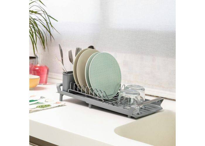 Detta mobila diskställ är idealiskt för diskbänken eller köksbänken. En avtagbar bestickkorg ingår. Den infällbara designen sparar utrymme.