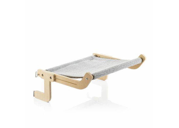 En hängmatta för katter med struktur av trä och metall och avtagbart ull-polyestertyg som går att tvätta i maskin. Skyddsdynorna förhindrar att den skadar stödytor.