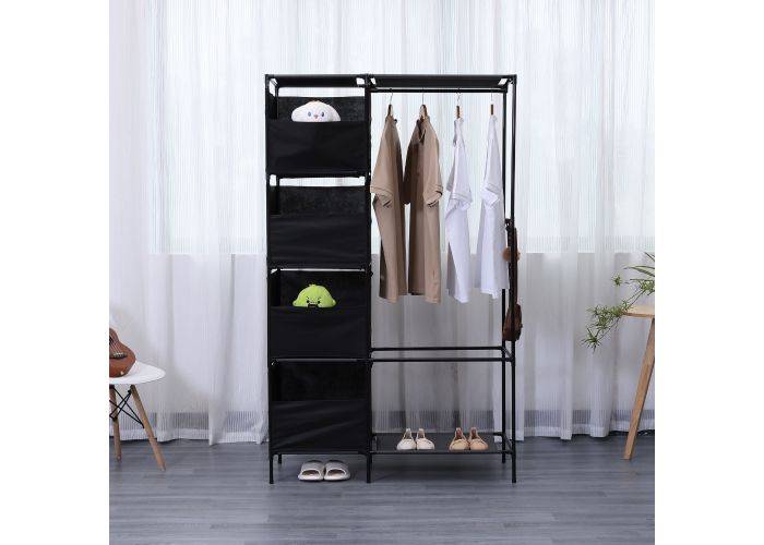Vacker fristående garderob i 2 fack med lådor och hängstång. Gott om plats för förvaring av kläder, skor och lådor. Praktisk och smart lösning för rum, badrum, garderober, hallar och många andra platser. Garderobsstället är tillverkat i en lätt stålkonstruktion som är slitstark och lätt att flytta runt.