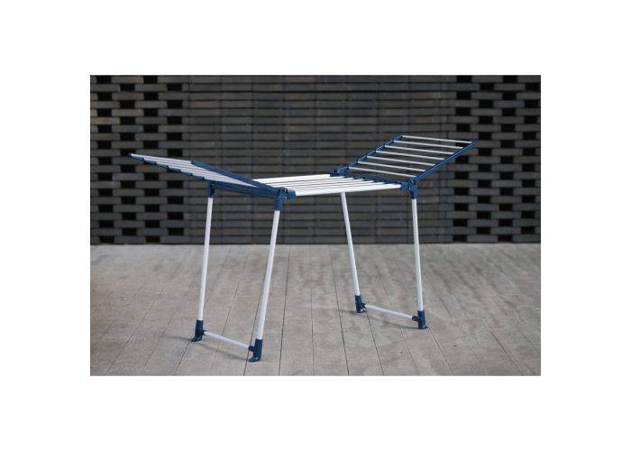 Stort torkställ med gott om plats att hänga upp dina kläder efter tvätt. Den vikbara designen gör att den nästan inte tar upp någonting när den inte används. När den är uppfälld finns det extra stavar vid fötterna som säkerställer bättre stabilitet och hållbarhet. Bra klassisk lösning för att torka kläder.