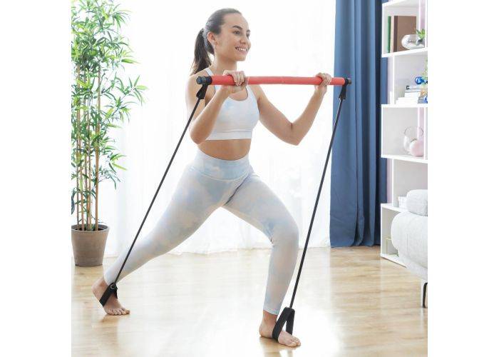 En träningsstång med elastiska motståndsband och träningsguide, som låter dig göra ett helt pass med ett brett utbud av övningar och stretchningar för att träna de 4 huvudmuskelgrupperna (bål, armar, ben, rygg). På grund av sin mångsidighet kan den användas i många positioner (stående, liggande...) och för olika sportgrenar, inklusive fitness, yoga, pilates, etc. Idealisk för att stärka och tona kroppens muskler (buk, armar) , ben, glutes, bröst, midja, axlar, rygg, etc.). Dess lätta, avtagbara och bärbara design gör den enkel att transportera och förvara, tar liten plats, vilket är en stor fördel för att komma i form utan att behöva samla på sig skrymmande träningsutrustning. Denna moderna, multifunktionella träningsstång med tensorer är ergonomisk, unisex och passar alla nivåer (från nybörjare till proffs). Dessutom är den mycket robust tack vare det inre metallröret och ger ett stadigt grepp med sin halkfria beläggning. Inkluderar 2 elastiska band, 2 grepphandtag för händer eller fötter och en hög motståndsnivå (upp till 31,75 kg/70 lb). Perfekt för träning hemma, även om den även kan användas utomhus.