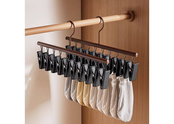 Tack vare låskroken kan ställningen fixeras stabilt – oavsett om du hänger den på en klädstång eller på en utomhustorkställning. När den står i garderoben håller den små textilier organiserade och luftiga. När den hänger utomhus kan den torka kläder effektivt, utan rädsla för att ställningen ska blåsa bort.