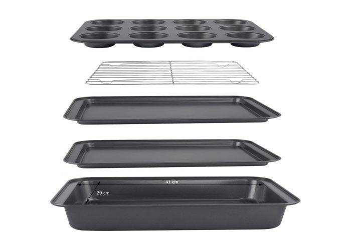 Förbättra din bakupplevelse med denna 5-delade bakformsuppsättning som innehåller allt du behöver för att baka kakor, muffins, kakor och ugnsstek. Det här setet är designat för att göra bakning och stekning roligare utan att behöva oroa dig för stökig städning efteråt.