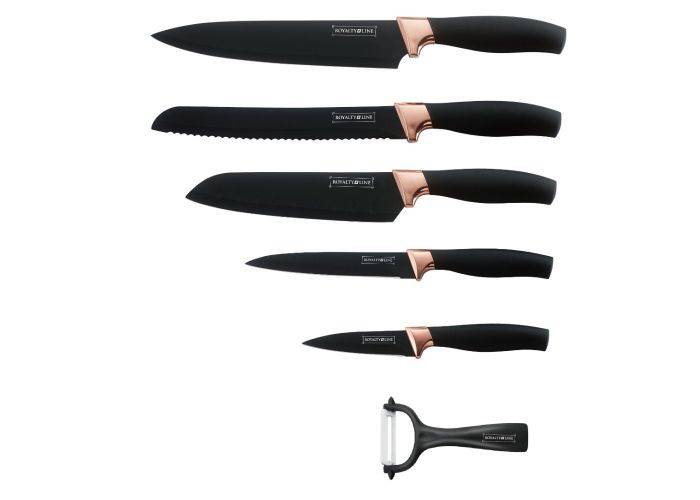 Superläckert knivset för vilket kök som helst i hög kvalitet från Royalty Line. Med en non-stick beläggning fastnar inte knivarna på maten och gör matlagningen lättare. Med de ergonomiska handtagen kan du använda dessa köksredskap under lång tid utan obehag i händerna.