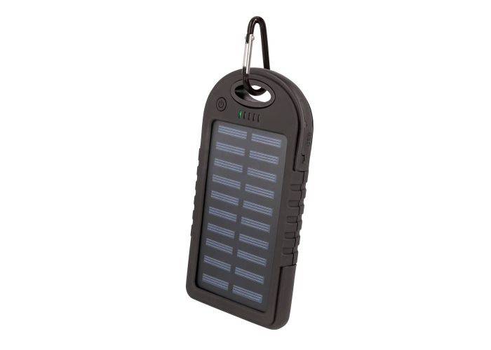 Smart powerbank med inbyggd solpanel och med en kapacitet på 5 000mAh får du massor av extra kraft till dina enheter. Det finns 2 USB-portar så att du kan ladda 2 enheter samtidigt. Den är perfekt för resor, vandring och alla utomhusresor, med den inbyggda solpanelen kan du få strömmen att räcka längre i starkt solsken och i ena änden finns ett inbyggt LED-ljus som kan fungera som en minificklampa och det är perfekt för många resor och turer. En praktisk krok medföljer också så att du enkelt kan fästa powerbanken på din väska/ryggsäck.