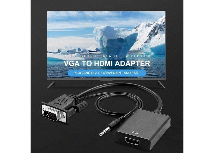 Med denna smarta adapter kan du ansluta din bärbara dator, PC eller liknande med VGA till en skärm, TV, projektor eller liknande med HDMI. VGA-änden ansluts till din bärbara dator och konverteras till digital signal med Full HD för din skärm. Allt som krävs är en HDMI-kabel som är ansluten från adaptern till din TV. En USB-strömkabel ingår som måste anslutas för extern ström under användning, det kan till exempel vara en vanlig USB-laddare. Anslut vid behov 3,5 mm ljudkabel för ljud.