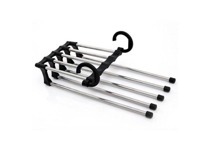 Smart ställ med plats för 5 par byxor, perfekt för att organisera dina byxor i garderoben. På så sätt kan du enkelt få plats med fler och du slipper fler veck i kläderna på så sätt. Kan hängas på två sätt. Tillverkad i snygg, stilren design i rostfritt stål och plast.
